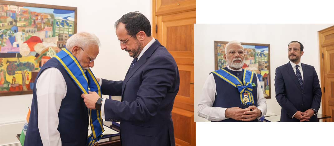 The President of Cyprus, H.E. Nikos Christodoulides, today conferred upon Prime Minister Shri Narendra Modi Cyprus’s honour – the “Grand Cross of the Order of