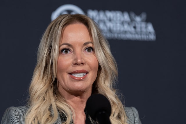 Jeanie Buss, President of the Los Angeles Lakers speaks during the permanent placement of late Kobe Bryant’s handprints and footprints in the forecourt of the
