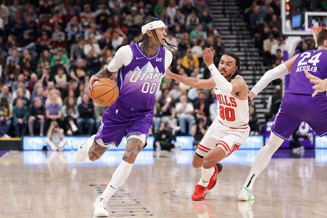 Mar 17, 2025; Salt Lake City, Utah, USA; Utah Jazz guard Jordan Clarkson (00) brings the ball up the court during the second quarter against