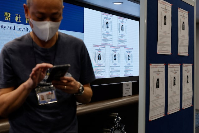Images of five activists Simon Cheng, Frances Hui, Joey Siu, Johnny Fok, and Tony Choi are displayed during a press conference to issue arrest warrants