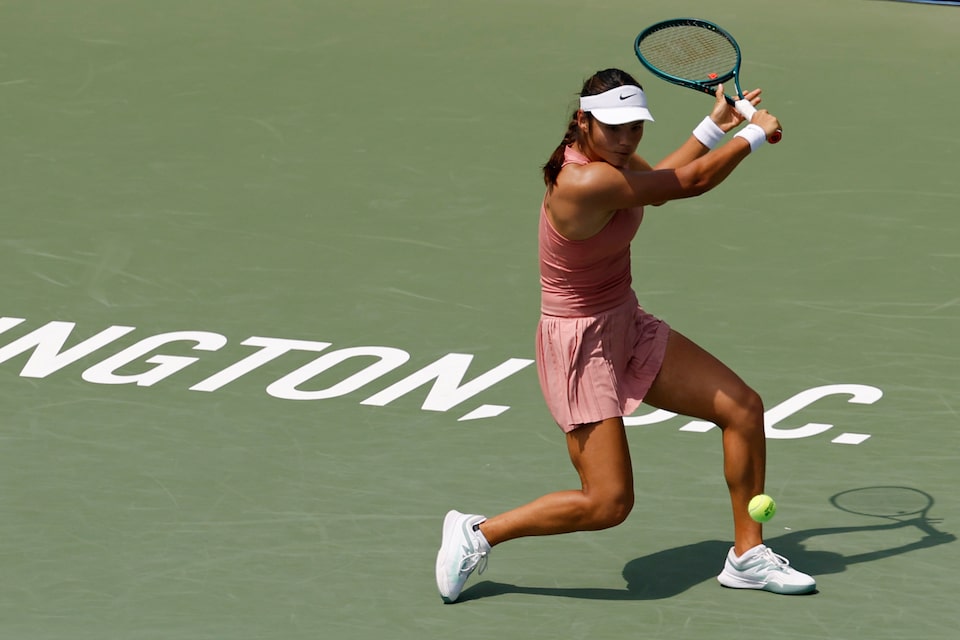 Jul 24, 2025; Washington, D.C., USA; Emma Raducanu (GBR) hits a backhand against Naomi Osaka (JPN)(not pictured) in a women’s singles match on day four