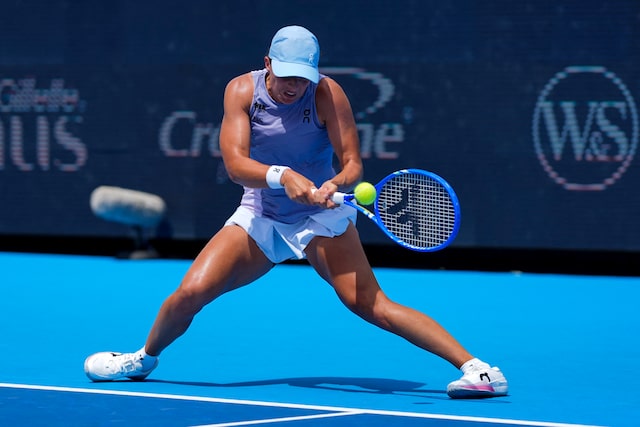 Aug 17, 2025; Cincinnati, OH, USA; Iga Swiatek (POL) returns a shot against Elena Rybakina (KAZ) during the Cincinnati Open at the Lindner Family Tennis
