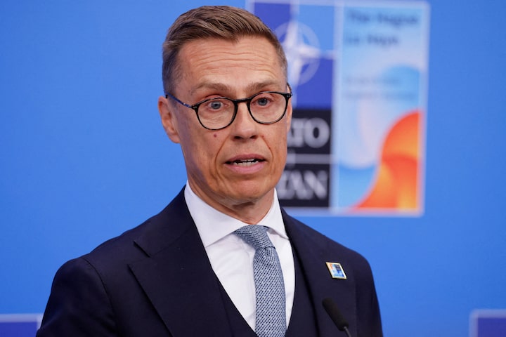 Finland’s President Alexander Stubb speaks to the media upon arriving to attend the North Atlantic Treaty Organization (NATO) Heads of State and Government summit in