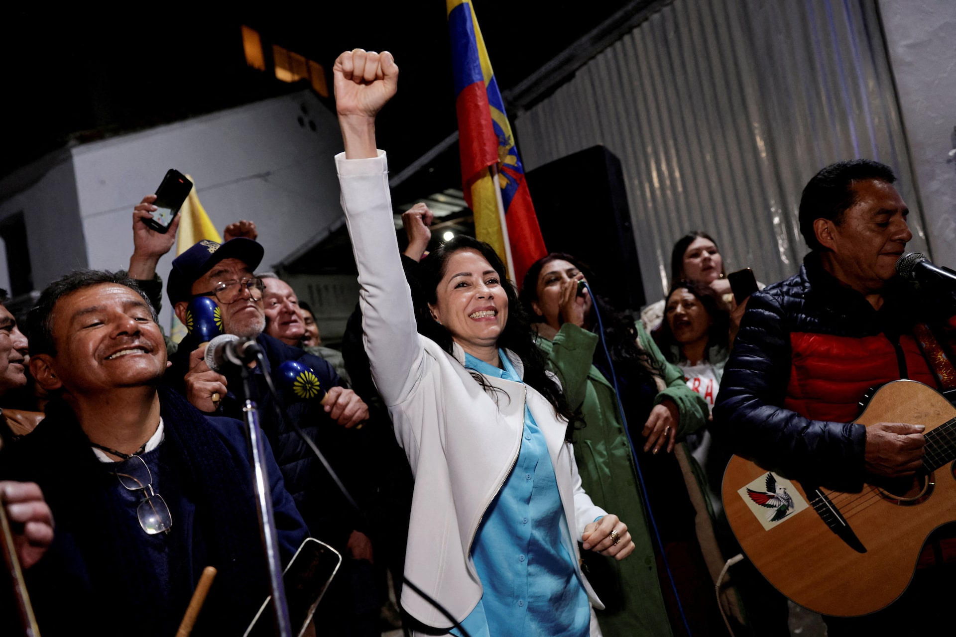 Luisa Gonzalez, President of the Citizens’ Revolution Movement, reacts following early results in a referendum to decide whether to allow the return of foreign military