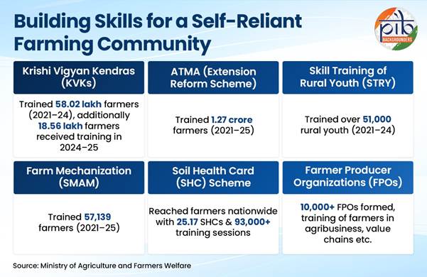 - Farmer Producer Organizations (FPOs): To build market-oriented capacity, the government has registered over 10,000 FPOs. Through digital modules and webinars, farmers in FPOs receive training on agri-business management, value chains and marketing. (By collectivizing smallholders, FPOs help deliver targeted skilling and extension in rural areas).