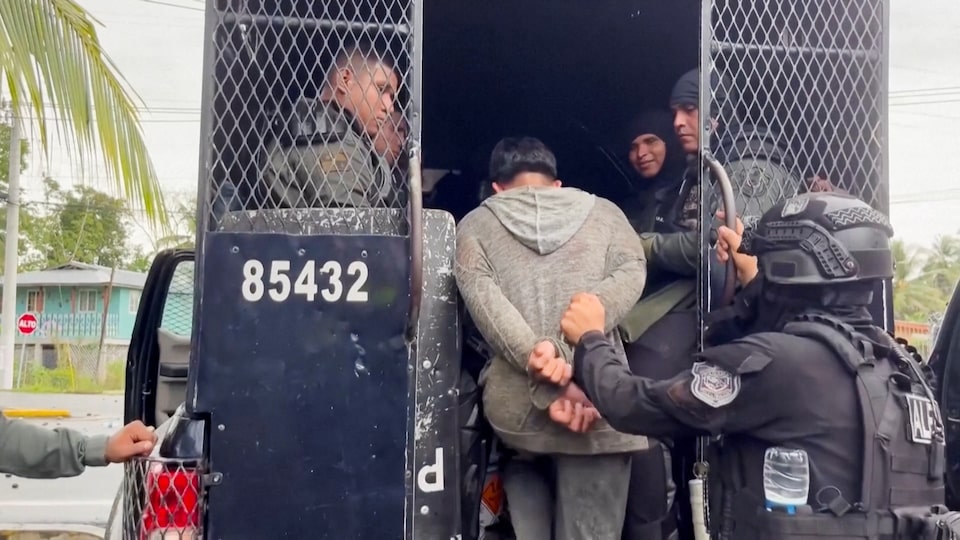 A detained demonstrator is loaded into a police vehicle during an operation by the police to clear roadblocks set up by protesters as part of