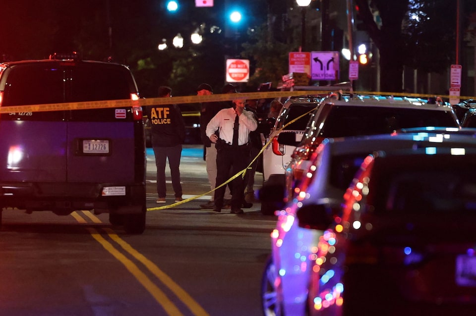 Police officers work at the site where, according to the U.S. Homeland Security Secretary, two Israeli embassy staff were shot dead near the Capital Jewish
