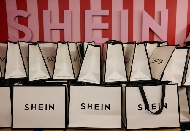 A company logo for fashion brand Shein is seen on a pile of gift bags on its Christmas bus as part of a nationwide promotional