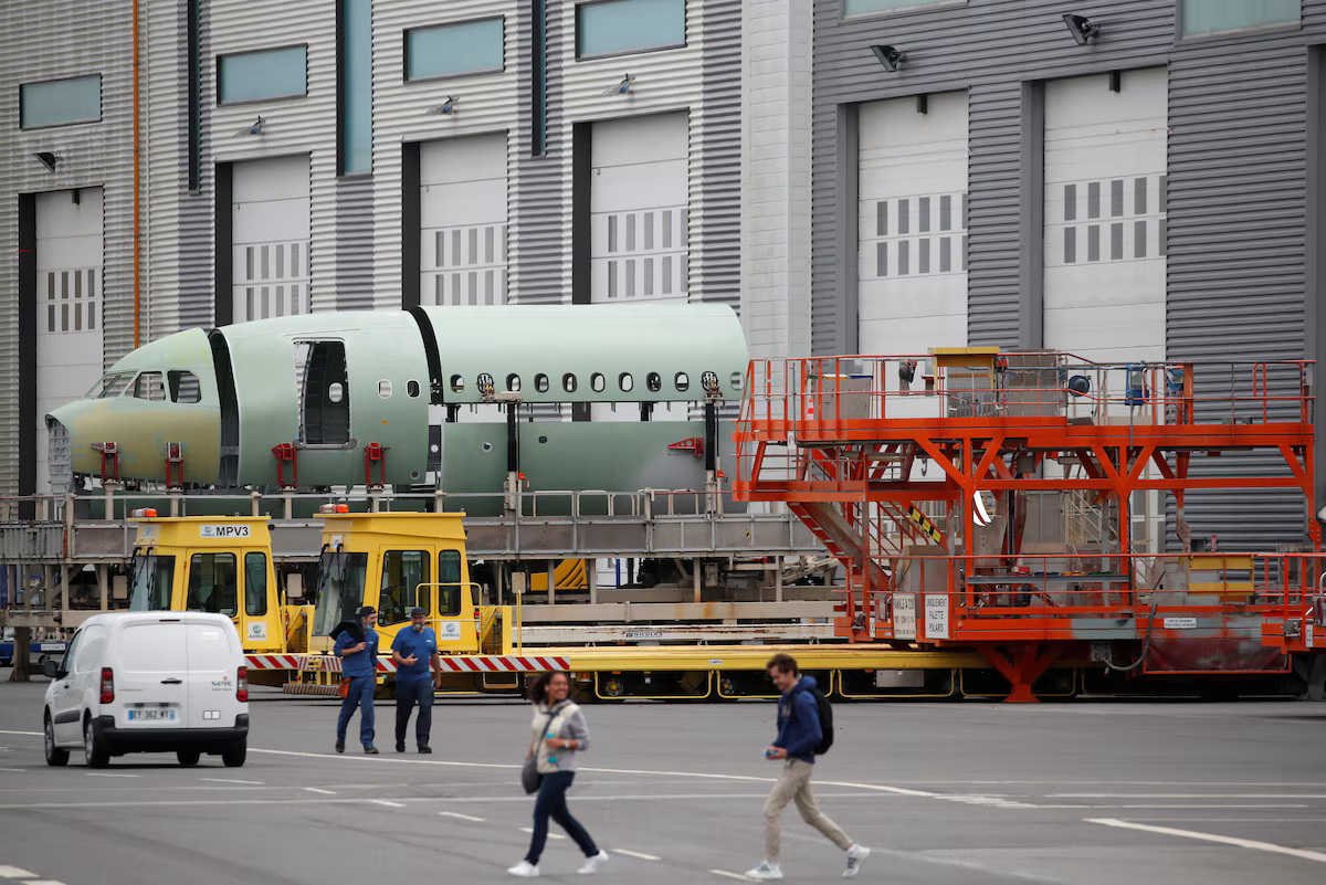 Employees walk past a fuselage section of an A320 Airbus airplane at the Airbus facility in Montoir-de-Bretagne near Saint-Nazaire, France, July 1, 2020. REUTERS (Reuters)