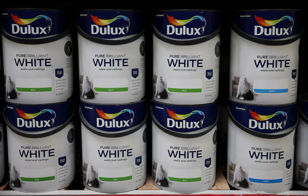 Cans of Dulux paint, an AkzoNobel brand, are seen on the shelf of a DIY retail store in Manchester, Britain, June 14, 2024. REUTERS April