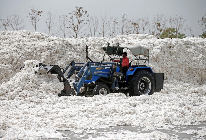 An employee shifts piles of cotton at a cotton processing unit in Kadi town, in the western Indian state of Gujarat, India, April 5, 2018.