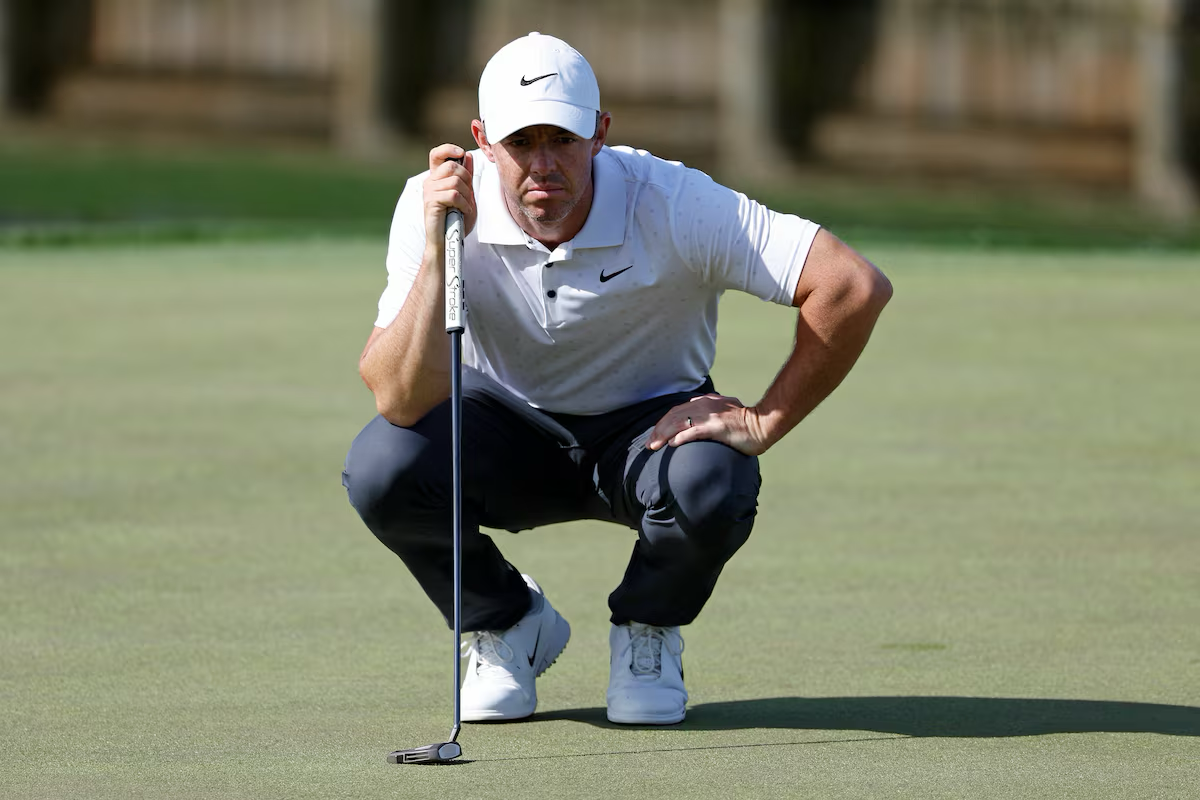 Mar 14, 2025; Ponte Vedra Beach, Florida, USA; Rory Mcllroy eyes his putt on the eighteenth green during the second round of The Players Championship