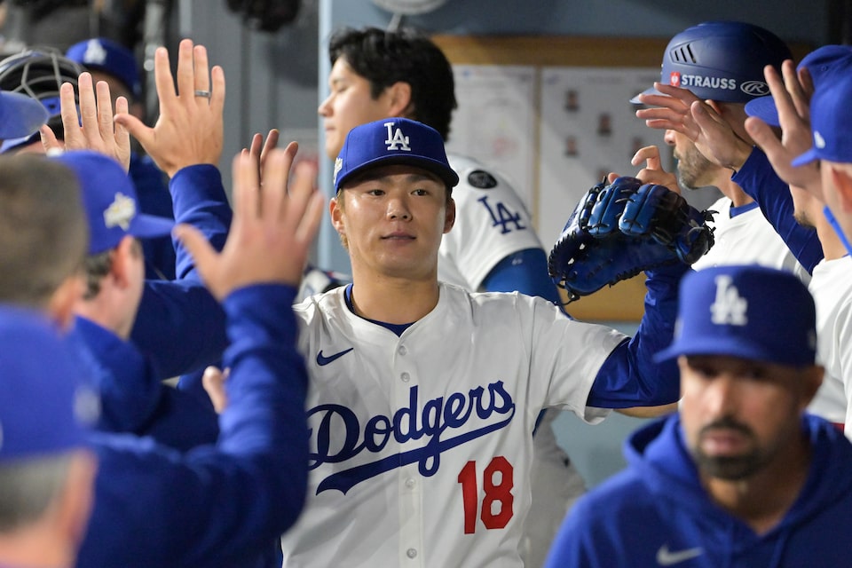 Oct 1, 2025; Los Angeles, California, USA; Los Angeles Dodgers starting pitcher Yoshinobu Yamamoto (18) celebrates with his teamamtes in the dugout after throwing against