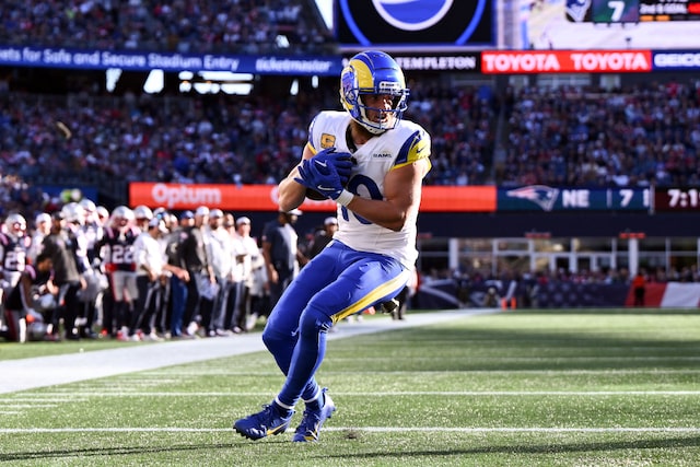 Nov 17, 2024; Foxborough, Massachusetts, USA; Los Angeles Rams wide receiver Cooper Kupp (10) scores a touchdown against the New England Patriots during the first