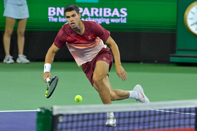 Mar 13, 2025; Indian Wells, CA, USA; Carlos Alcaraz (ESP) hits a shot as he defeated Francisco Cerundolo (not pictured) in the quarterfinal of the