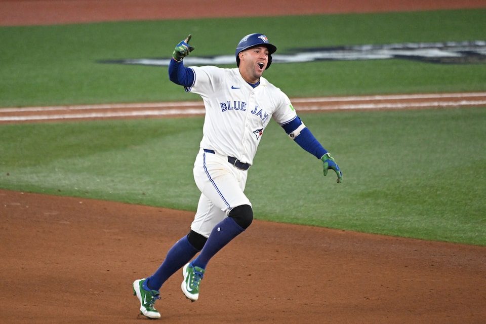 Toronto, Ontario, CAN; Toronto Blue Jays right fielder George Springer (4) celebrates as he runs the bases after hitting a three run home run against