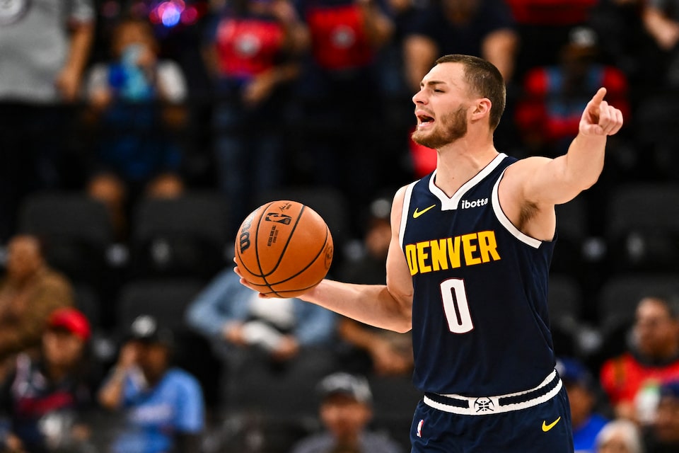 Oct 12, 2025; Inglewood, California, USA; Denver Nuggets forward Christian Braun (0) looks to pass the ball against the Los Angeles Clippers during the third