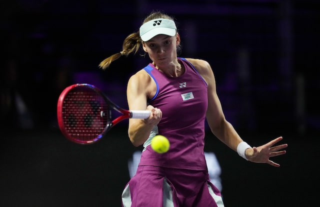 Tennis – WTA Finals – King Saud University Indoor Arena, Riyadh, Saudi Arabia – November 6, 2024 Kazakhstan’s Elena Rybakina in action during her women’s