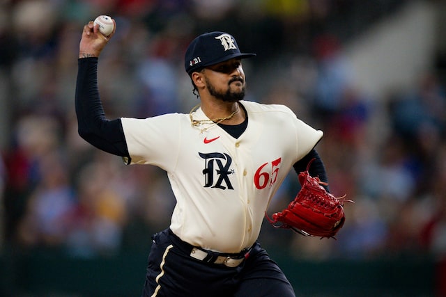 Aug 18, 2023; Arlington, Texas, USA; Texas Rangers relief pitcher Grant Anderson (65) pitches against the Milwaukee Brewers during the eighth inning at Globe Life