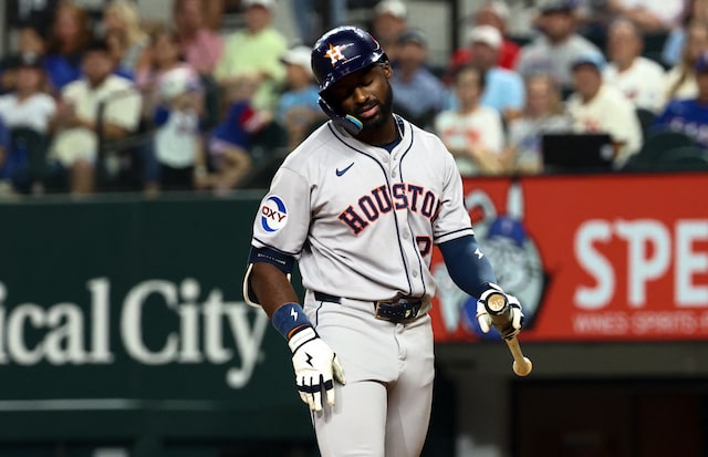 Sep 5, 2025; Arlington, Texas, USA; Houston Astros center fielder Taylor Trammell (26) reacts after striking out during the fourth inning against the Texas Rangers