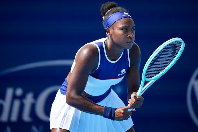 Aug 14, 2025; Cincinnati, OH, USA; Coco Gauff (USA) awaits the serve from Lucia Bronzetti (ITA) during the Cincinnati Open at the Lindner Family Tennis