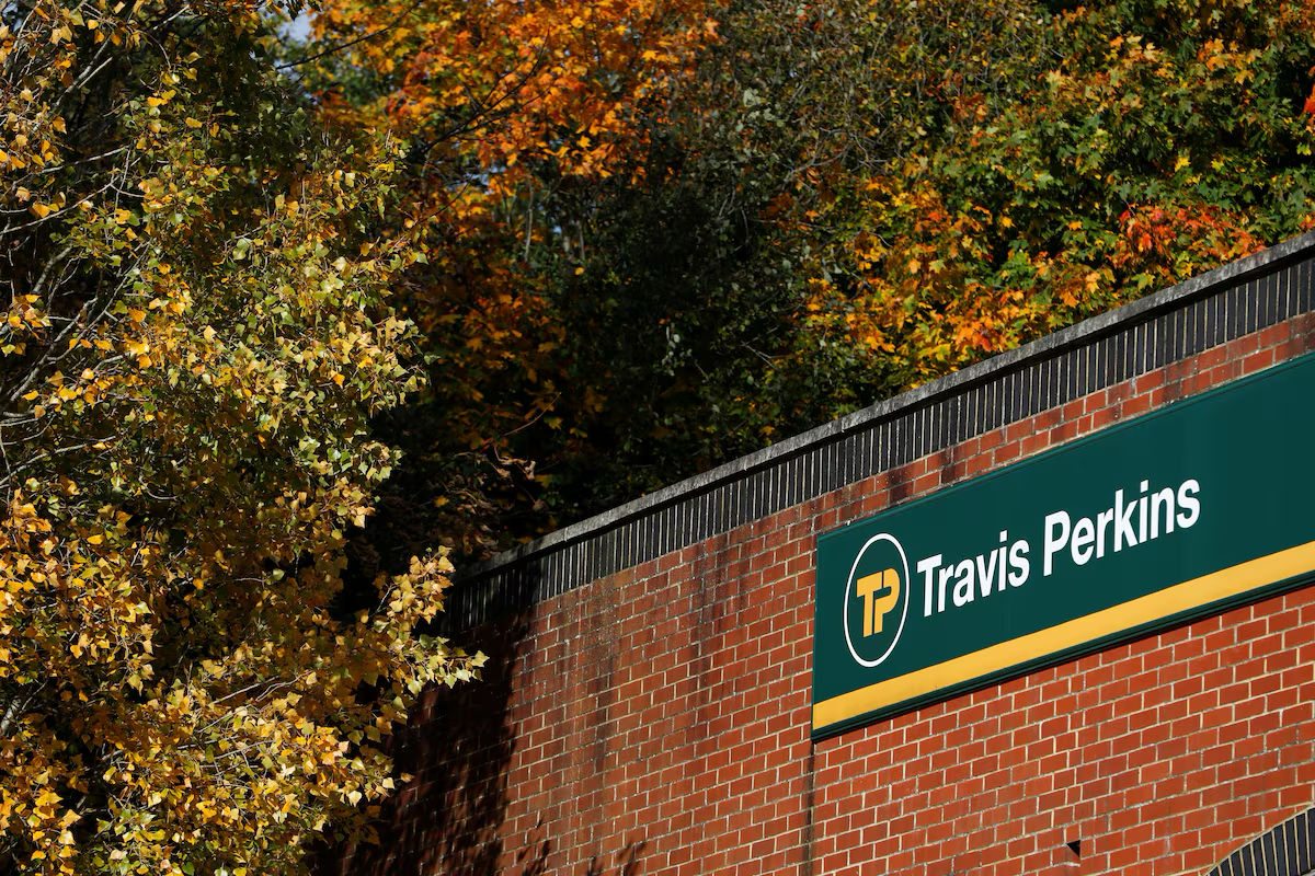 A signage is pictured at a building of Travis Perkins, a timber and building merchants yard in St Albans, Britain October 22, 2020. REUTERS April