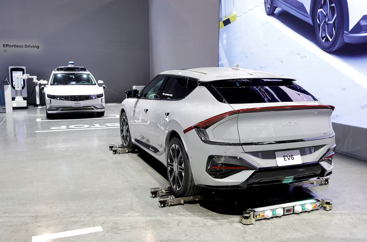 A Kia EV6 is moved with A H-Motion robots, a Hyundai WIA autonomous parking system, in the Hyundai Motor Group booth during CES 2026, an