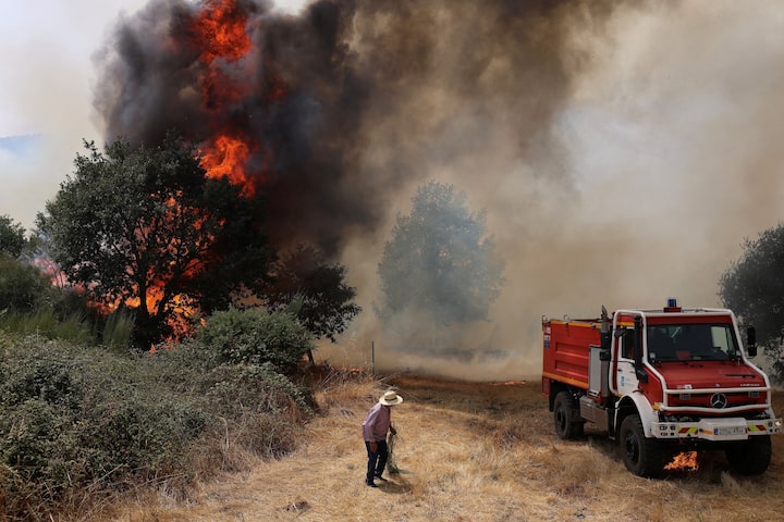 A person stands near an emergency vehicle, as a wildfire rages in Veiga das Meas, near Verin, Ourense province, Galicia, Spain, August 16, 2025. REUTERS