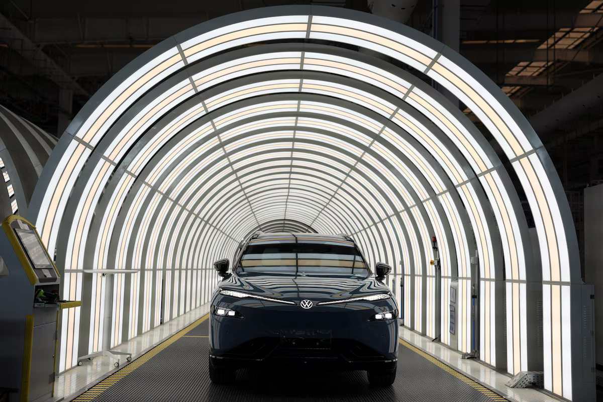 A Volkswagen ID. UNYX 08 electric vehicle (EV) sits on a production line at the Volkswagen Anhui factory in Hefei, Anhui province, China February 4,