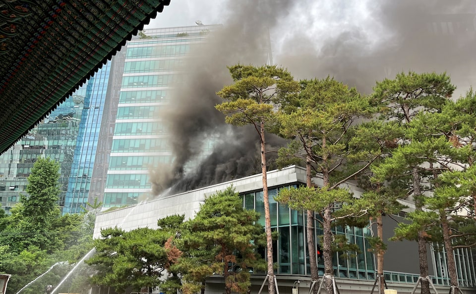 Smoke billows from a fire in the Central Buddhist Museum building next to Jogye Temple in Seoul, South Korea, Jun 10, 2025. REUTERS