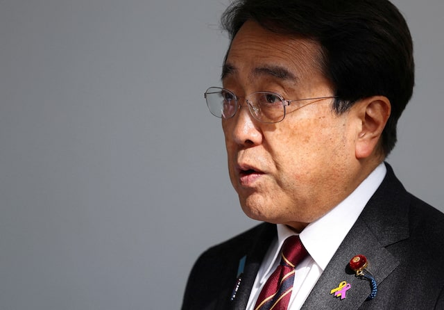 Japan’s Economic Revitalization Minister Ryosei Akazawa speaks to the press upon his arrival at Haneda Airport, a day after ministerial talks on tariffs, with U.S. President Donald Trump joining the negotiators, in Tokyo, Japan, April 18, 2025. REUTERS.