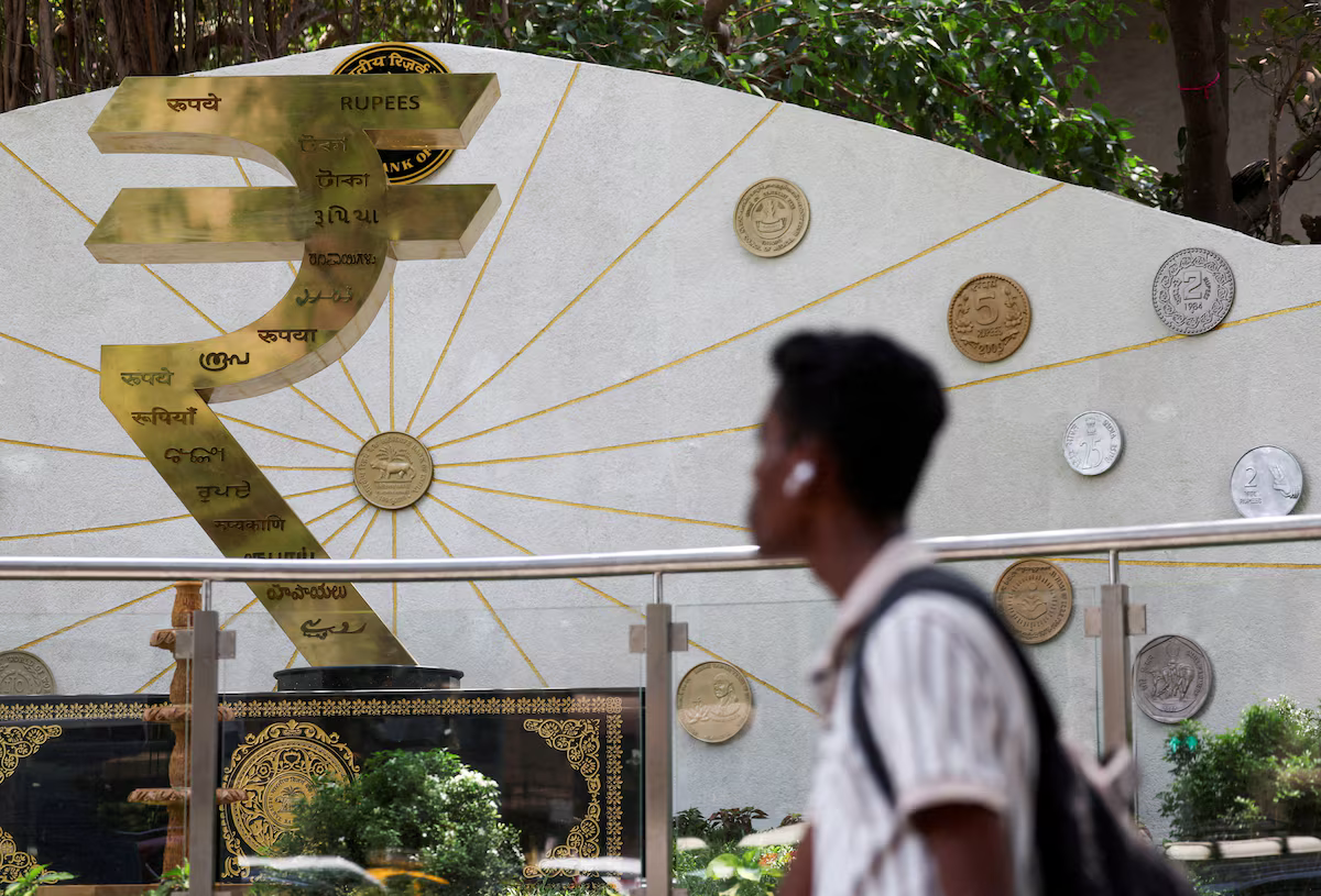 A man walks past an installation of the Rupee logo and Indian currency coins outside the Reserve Bank of India (RBI) headquarters in Mumbai, India, April 9, 2025. REUTERS
