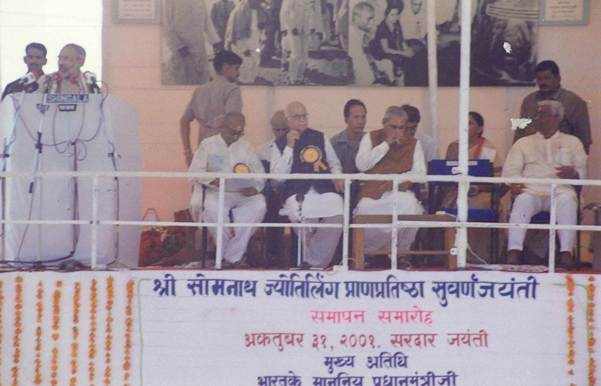 Hon’ble Prime Minister Narendra Modi attended the programme held on 31 October 2001, marking 50 years since the rebuilt Somnath Temple was reopened in the year 1951. The occasion highlighted the pivotal role played by Sardar Vallabhbhai Patel, K. M. Munshi and several others in the reconstruction of the temple. The programme also coincided with the 125th birth anniversary of Sardar Vallabhbhai Patel and was attended by the then Prime Minister Atal Bihari Vajpayee, the then Home Minister Lal Krishna Advani, and other dignitaries.