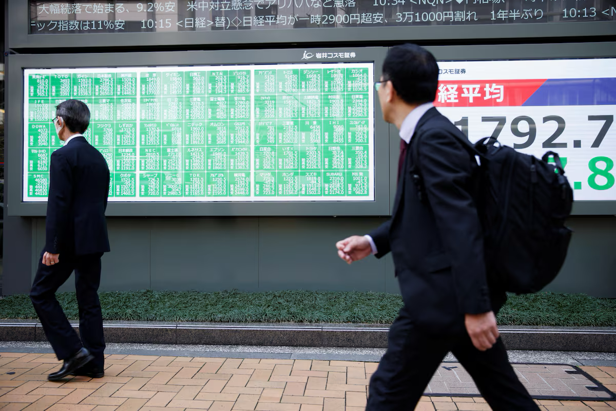 Men walk past a stock quotation board at a brokerage in Tokyo, Japan, April 7, 2025. REUTERS