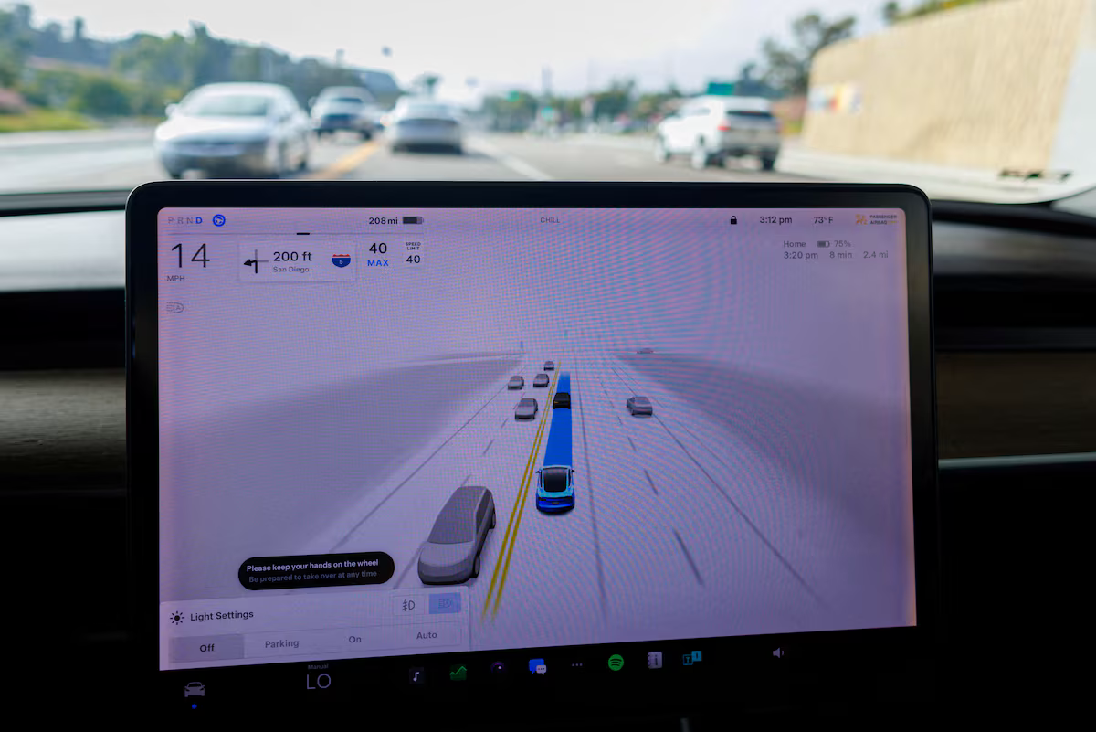 A Tesla Model 3 vehicle warns the driver to keep their hands on the wheel and be prepared to take over at anytime while driving using FSD (Full Self-Driving) in Encinitas, California, U.S., October 18, 2023. REUTERS