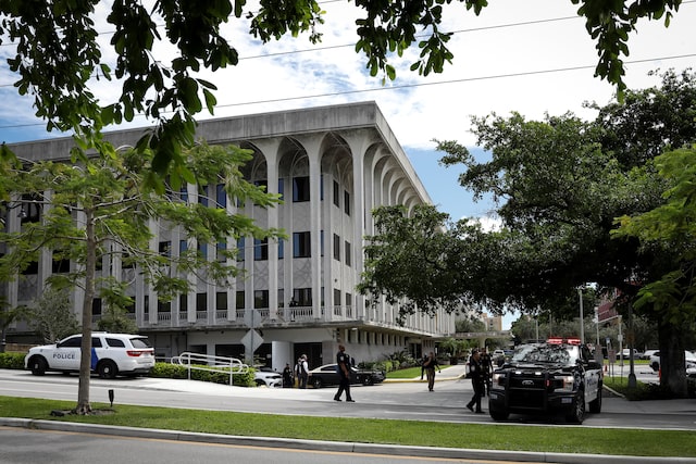 A law enforcement motorcade, presumably to be carrying Ryan W. Routh, the reported suspect in an apparent assassination attempt on Republican presidential nominee and former U.S. President Donald Trump, is seen, outside the Paul G Rogers Federal Building U.S. Courthouse in West Palm Beach, Florida, U.S. September 23, 2024.