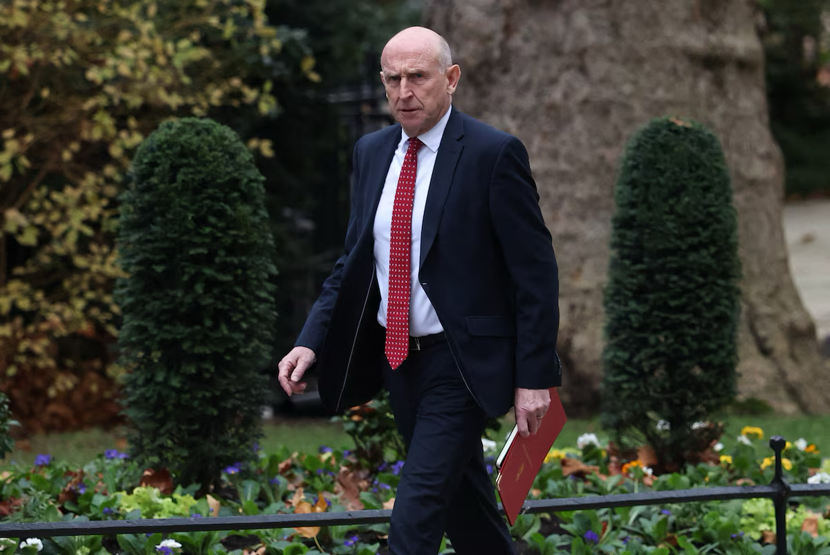 British Defence Secretary John Healey walks outside Downing Street, in London, Britain, November 18, 2025. REUTERS
