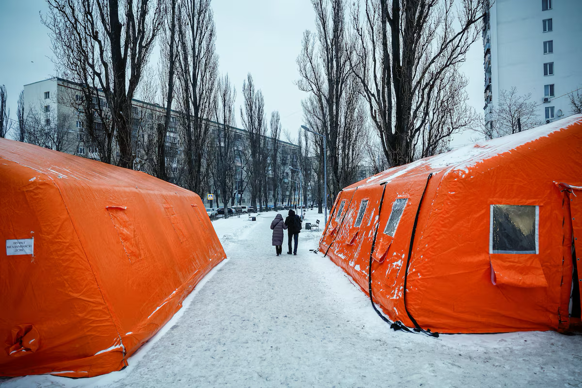 People pass by a Point of Invincibility center, a government-run shelter which offers basic services and heat during blackouts, where residents warm up and charge their devices, during power cut-offs after critical civil infrastructure was hit by recent Russian missile and drone strikes, amid Russia’s attack on Ukraine, in Kyiv.