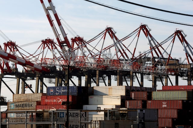 Containers are stacked beneath cranes at Port Newark Container Terminal in Newark, New Jersey, U.S., October 4, 2024. REUTERS