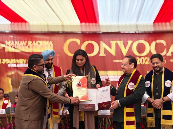 During the ceremony, Honoris Causa degrees were conferred upon distinguished personalities in recognition of their outstanding contributions to society. The recipients included Justice Gita Mittal (MRU); Ms. Shreyasi Singh, Sports Minister of Bihar (MRIIRS); Dr. Anil Kumar J. Nayak, National President, Indian Medical Association (MRIIRS); and H.E. Dr. Ian Borg, Honourable Deputy Prime Minister and Minister of Foreign Affairs & Tourism, Republic of Malta (MRIIRS).