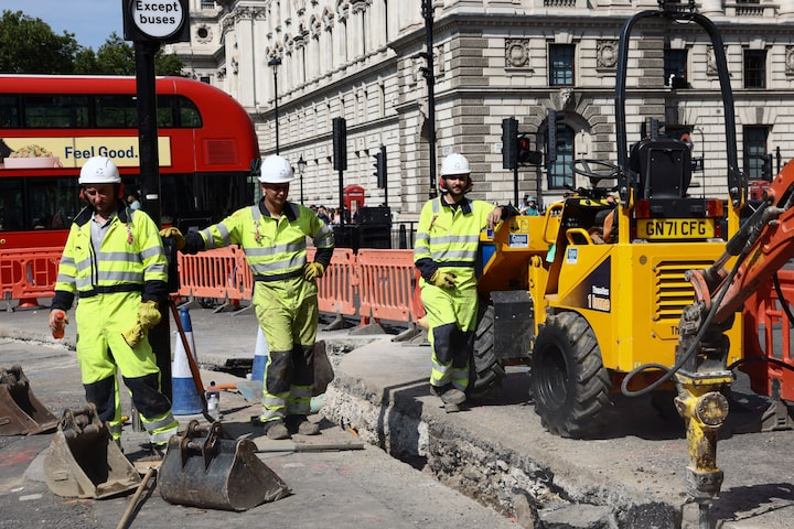 Workmen pause as they dig up a section of road in Westminster during a heatwave, in London, Britain, August 12, 2025. REUTERS
